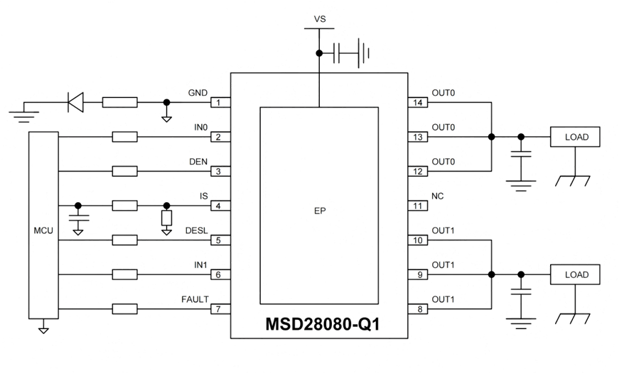 24V系統的雙通道80mΩ級別智能高邊開關